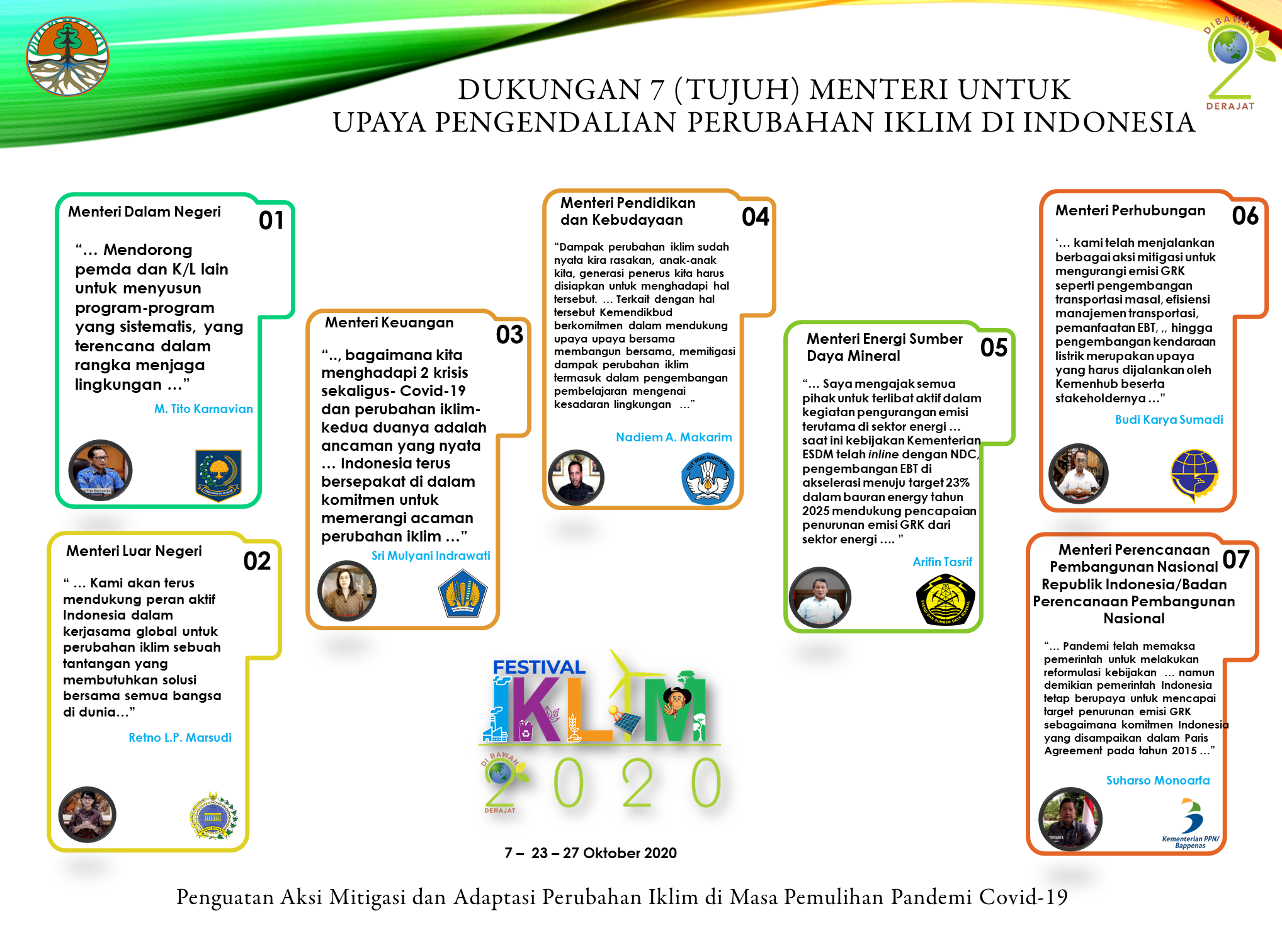 Pada puncak Acara secara khusus Menteri Keuangan, Meteri Dalam Negeri, Menteri Luar Negeri, Menteri ESDM, Menteri Perhubungan, Menteri Pendidikan, Menteri Perencanaan Pembangunan Nasional menyampai ucapan selamat pada acara puncak Festival Iklim 2020