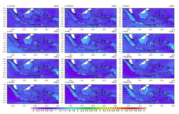 Berdasarkan hasil analisis dengan data skenario RCP 4.5, perubahan suhu ekstrem (28-30oC) terjadi pada tahun 2021 sampai dengan 2050 terjadi di Provinsi Riau, Sumatera Selatan, Lampung, bagian pesisir utara Jawa, Kalimantan Barat, Kalimantan Tengah, dan Papua.