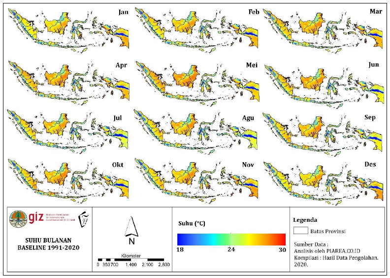 Berdasarkan data WorldClim, pada wilayah di Indonesia umumnya bersuhu 22-26oC. Namun di wilayah dataran tinggi suhunya lebih rendah yaitu berkisar 16-20oC, seperti wilayah Jawa, Sulawesi, dan Sumatera Utara. Bahkan pada wilayah Papua bagian pegunungan suhu berkisar 0-16oC.