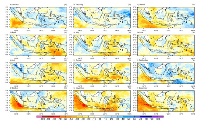 Hasil proyeksi curah hujan mengalami anomali peningkatan curah hujan bulanan melebihi 200 mm/bulan. Pada skenario RCP 4.5 dengan persentil ke-25, 50, dan 74 yang berasal dari distribusi ensemble CIMP5 menunjukkan bahwa curah hujan tahunan dapat menurun sampai dengan 20%, khususnya pada wilayah bagian selatan pada periode 2016 sampai dengan 2035. Berdasarkan data Climate Outlooks (2019), dengan menggunakan data baseline pada tahun 2010 terdapat perubahan kondisi curah hujan pada tahun 2030. Wilay