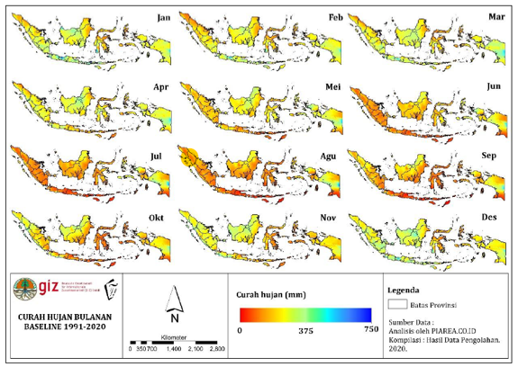 Berdasarkan pengamatan pada data WorldClim pada tahun 1991 sampai dengan 2020, kondisi curah hujan di Indonesia secara umum berkurang pada bulan kering (Juni-September). Wilayah yang dalam kondisi sangat kering yaitu Pulau Sumatera, Jawa, Bali hingga NTT. Sedangkan wilayah yang berada pada kondisi basah dengan curah hujan yang tinggi yaitu Jawa Tengah, Kalimantan Utara, dan sebagian wilayah Papua.