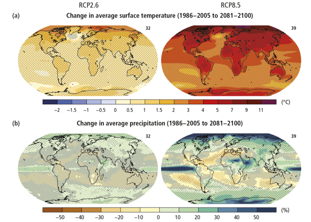 Ket: Perubahan suhu permukaan rata-rata (a) dan perubahan curah hujan rata-rata (b) berdasarkan proyeksi rata-rata multi-model