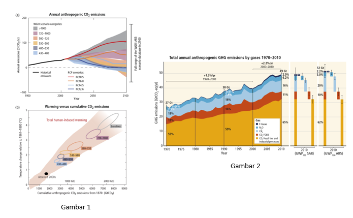 (1) Emisi kabon dioksida antropogenik tahunan (a) dan Kenaikan suhu permukaan rata-rata global pada saat emisi CO2 global mencapai total kumulatif bersih tertentu (b) (2) Total emisi gas rumah kaca (GRK) antropogenik tahunan (gigaton setara CO2 per tahun, GtCO2-eq / tahun) untuk periode 1970 hingga 2010
