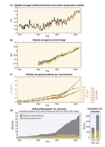 (a) Rata-rata tahunan dan global dari gabungan anomali relatif suhu permukaan laut dan daratan terhadap rata-rata selama periode 1986 hingga 2005. (b) Perubahan permukaan laut rata-rata tahunan dan global relatif terhadap rata-rata selama periode 1986 hingga 2005. (c) Konsentrasi atmosfer dari gas rumah kaca karbon dioksida (CO2, hijau), metana (CH4, oranye) dan nitrous oksida (N2O, merah) ditentukan dari data inti es (titik) dan dari pengukuran atmosfer langsung (garis). (d) Emisi CO2 antropoge